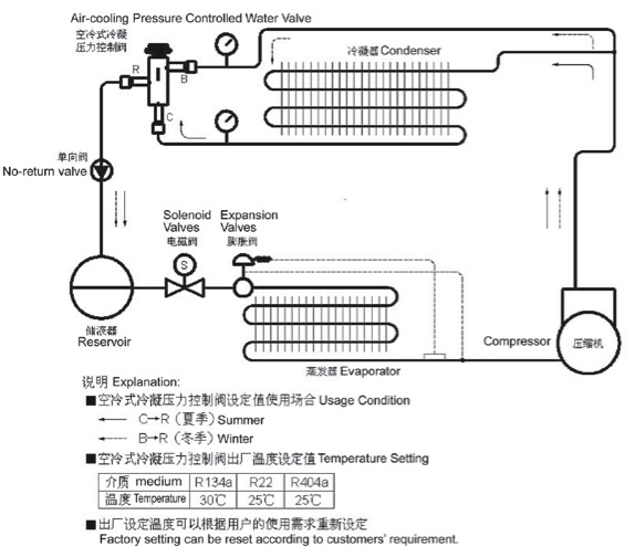 Air-cooling pressure controlled water valves can be used in condenser or air-conditioning unit to maintain pressure of constant condenser and liquid receiver. It can apply to the change of outdoors, control the pressure, prevent pressure drop in winter, steady working all years. Also, it keeps the right inlet pressure of expansion valves, prevent the decrease in cold. Otherwise, it can be used in hot gas defrosting.