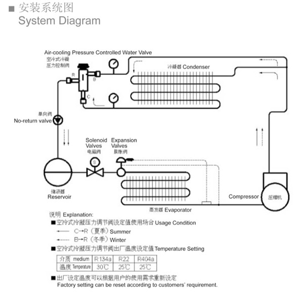 Air-cooling pressure controlled water valves can be used in condenser or air-conditioning unit to maintain pressure of constant condenser and liquid receiver. It can apply to the change of outdoors, control the pressure, prevent pressure drop in winter, steady working all years. Also, it keeps the right inlet pressure of expansion valves, prevent the decrease in cold. Otherwise, it can be used in hot gas defrosting.