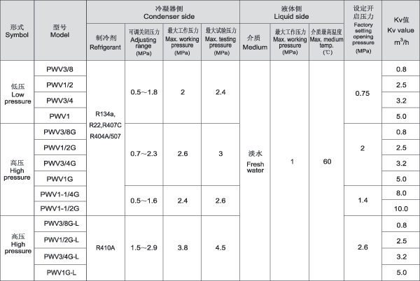 PWV系列冷凝压力调节阀一般安装在冷凝器的冷却水管路上(通常安装在冷凝器的进水端),根据冷凝压力的不安化来调节冷却水的流量。